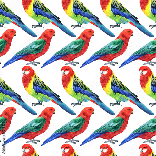 © Kat_branch_art, Obraz premium Watercolor cute parrot pattern. Pattern parrot. Watercolor cute animal. Watercolor cute bird. Hand painting postcard isolated white background. birds. cute pattern. cute parrot pattern.