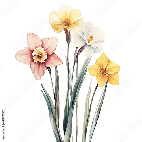 © siyam, Fototapeta premium Watercolor Daffodil Flower Arrangement In Pink Yellow And White On Transparent Background