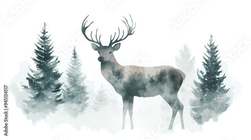 Obraz premium Watercolor Deer Silhouette in Misty Forest
