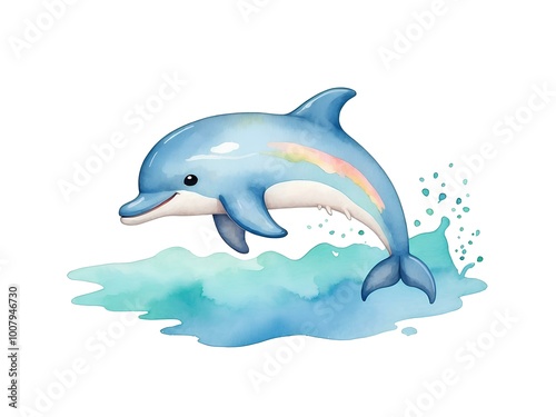 © Adibah, Fototapeta premium Watercolor dolphin clipart, cute dolphin, underwater theme, nursery decor, dolphin wall art, illustration, white background, undersea animal