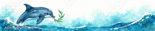 © OneWayPhoto, Naklejka premium Watercolor drawing of a happy dolphin playing with seaweed in the ocean, seaweed, marine life