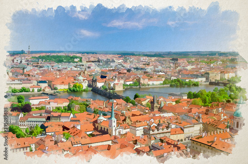© Aliaksandr, Obraz premium Watercolor drawing of Top aerial panoramic view of Prague historical city centre