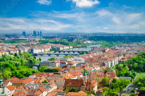 © Aliaksandr, Obraz premium Watercolor drawing of Top aerial panoramic view of Prague historical city centre with red tiled roof buildings in Mala Strana