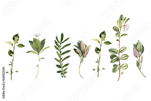 Fototapeta premium watercolor drawing plants and flowers, isolated at white background, natural...