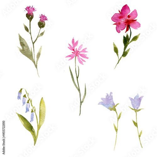 Naklejka premium watercolor drawing wild flowers, flowering plants at white background, floral...