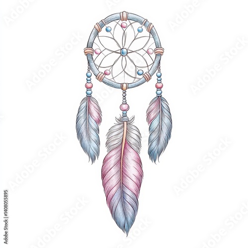 © Thanathas, Obraz premium Watercolor Dreamcatcher with Pink and Blue Feathers and Beads