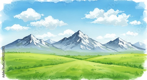 © Thuy, Fototapeta premium Watercolor Dreamscape: Verdant Valley and Majestic Peaks AI Generated