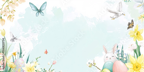Fototapeta premium Watercolor Easter background with bunny, eggs, flowers, butterflies, and bird in pastel colors for spring holiday celebration and decoration