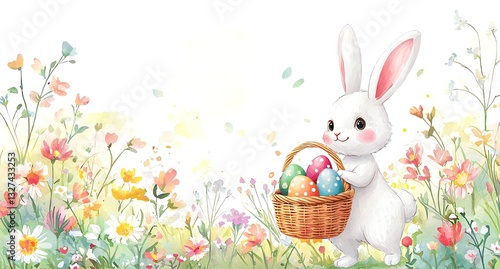 Obraz premium Watercolor Easter Bunny with Basket of Colorful Eggs in Spring Setting
