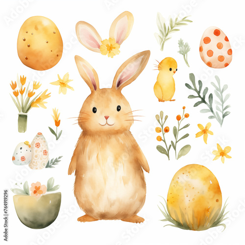 Obraz premium Watercolor Easter set, Easter bunny, eggs, chicken Generation AI