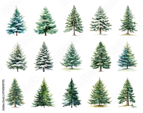 Fototapeta premium Watercolor evergreen trees collection.