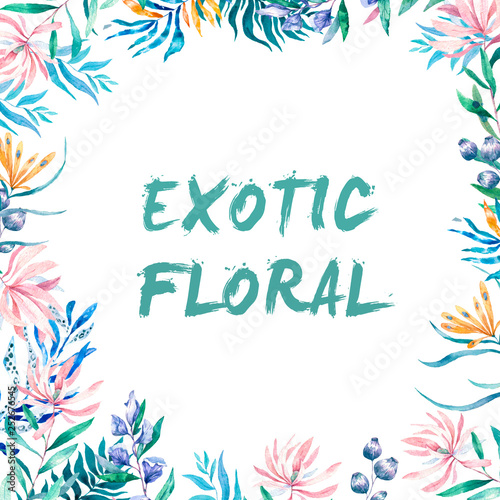Fototapeta premium Watercolor exotic frame with tropical leaves, flowers and toucan for wedding,...