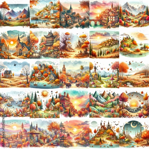 © vector_master, Fototapeta premium Watercolor fall landscapes. AI generated illustration