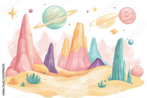 Naklejka premium Watercolor Fantasy Landscape Design. Imaginative watercolor landscape of fantastical world, ideal for t-shirt designs. It features colorful planets, stars, and stylized mountains in vibrant palette
