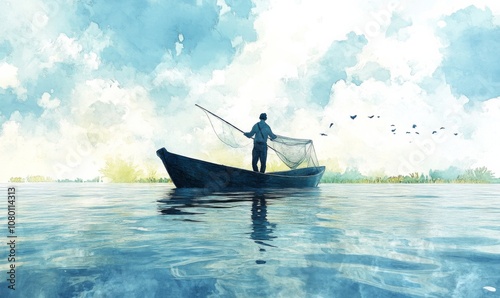 Fototapeta premium Watercolor fisherman casting a net from a boat, natural and serene, 3D...