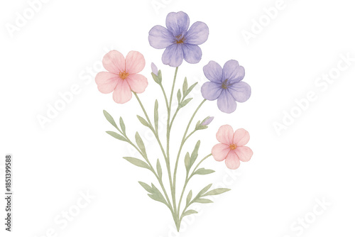© Michael, Fototapeta premium Watercolor floral arrangement with pink and purple spring blossoms and green leaves, transparent background design element