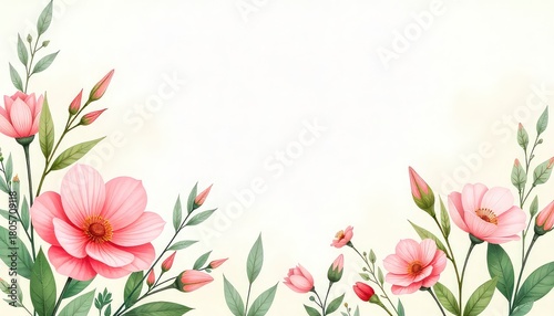© Aqeelabibi, Naklejka premium Watercolor floral arrangement with pink flowers buds and green leaves on a cream colored background
