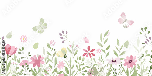 © Bijoy, Fototapeta premium Watercolor floral border with delicate pink blossoms and a flying butterfly