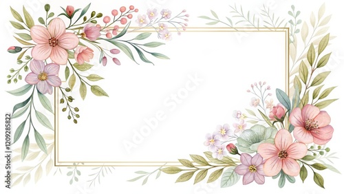 Obraz premium Watercolor Floral Frame Peach and Pink Blooms, Gold Rectangle, Botanical Illustration, Wedding Invitation Design Floral frame, watercolor painting