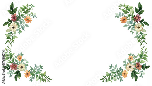 © NewFresh , Fototapeta premium Watercolor floral frame with green leaves and flowers. Vector illustration.