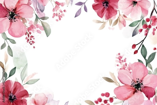© ddwi, Fototapeta premium Watercolor floral frame with pink flowers and leaves on white background.