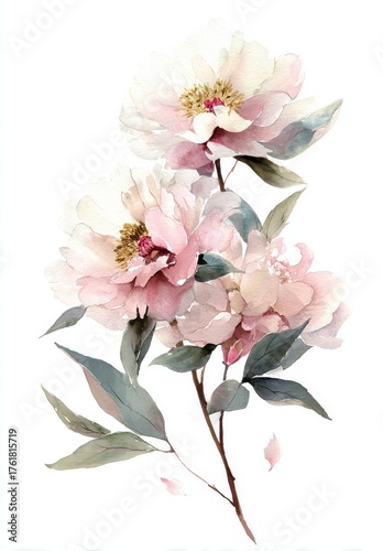 Obraz premium Watercolor floral illustration of light pink peonies, elegant botanical artwork.