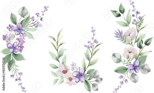 © Rizky, Fototapeta premium Watercolor floral wreath featuring vibrant purple flowers and lush green leaves arranged in a circular design.