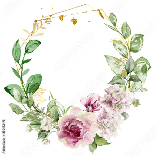 © Adorabella, Naklejka premium Watercolor flower wreath with gold frame.
