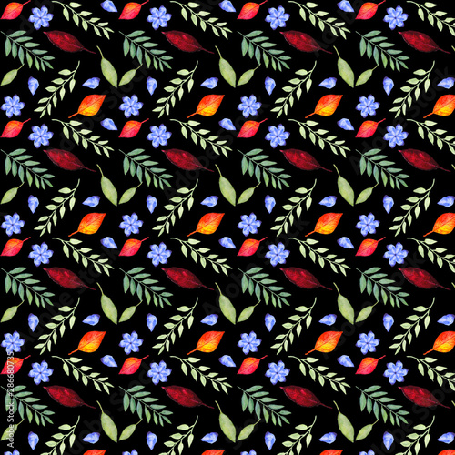 Fototapeta premium Watercolor flowers and leaves pattern. Hand painted watercolor leaves,...