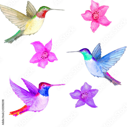 Obraz premium Watercolor. Flowers and three birds in the air.