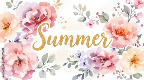 © Natalia, Naklejka premium Watercolor flowers and word summer