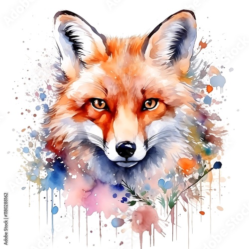 Naklejka premium Watercolor fox emerging from colorful splashes and flowers