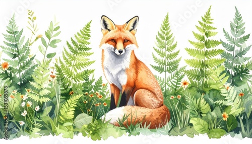 Obraz premium Watercolor Fox Portrait Amidst Ferns and Wildflowers, Forest Edge Illustration