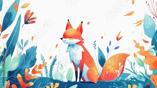 Obraz premium Watercolor fox with orange fur standing among colorful leaves and plants illustration