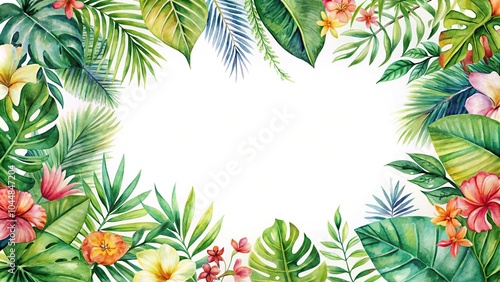 © Atittaya, Naklejka premium Watercolor frame of tropical leaves and flowers on white background