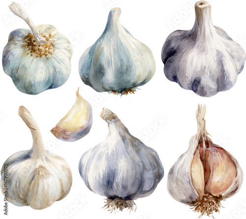 Obraz premium Watercolor Garlic Ensemble on Black, Clipping Path Illustration