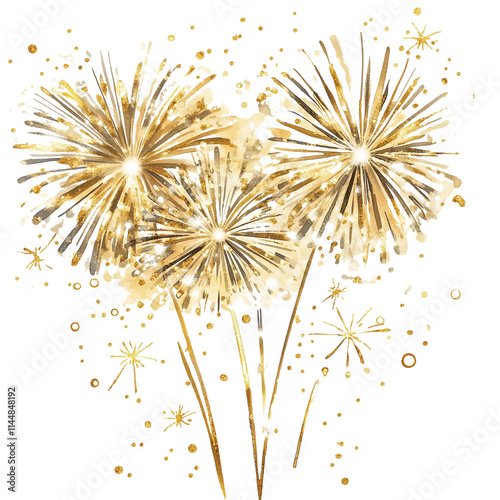 © tarek, Obraz premium Watercolor gold fireworks bursting in sky, isolated on transparent background