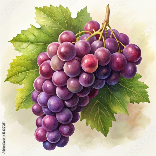 Fototapeta premium Watercolor grape bunch, purple grapes, green leaves