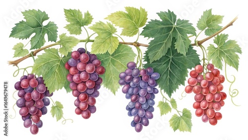 © PhotoParadise, Fototapeta premium Watercolor Grapevine Red, Purple Grapes with Green Leaves,Fruit, Art