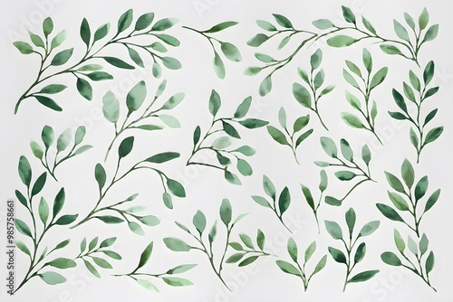 © Nida, Naklejka premium Watercolor green leaves and branches, lush canopy, vibrant against white