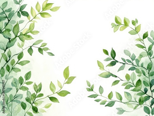 © Liliya, Obraz premium Watercolor Green Leaves Frame Illustration Natural Verdure Spring Summer Eco-Friendly