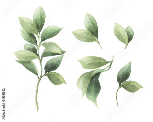 Naklejka premium Watercolor green leaves isolated. Botanical watercolor illustration set on...