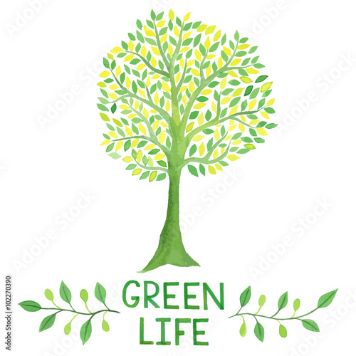 © happiestsim, Obraz premium Watercolor green logo with green tree. Green life.