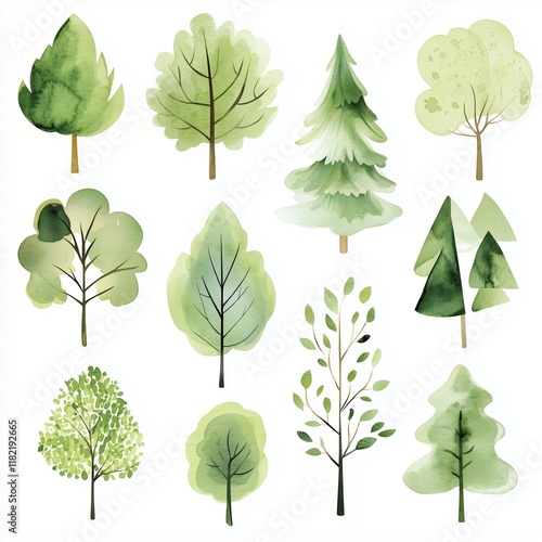© Ailee Tian, Fototapeta premium Watercolor green trees isolated on a white background.