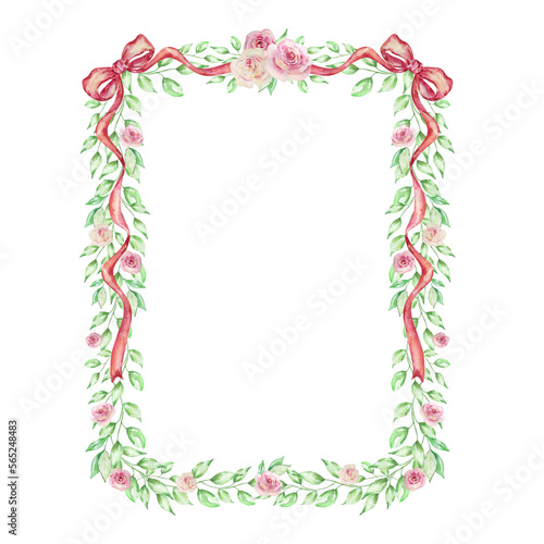 Fototapeta premium Watercolor Greenery Floral Frame with flowers, bows and ribbons