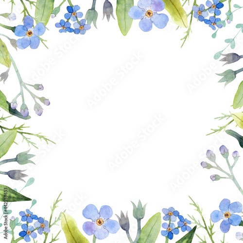 © Katurlich, Obraz premium Watercolor hand drawn isolated floral frame with blue flowers on white background. Forget-me-nots and greenery.