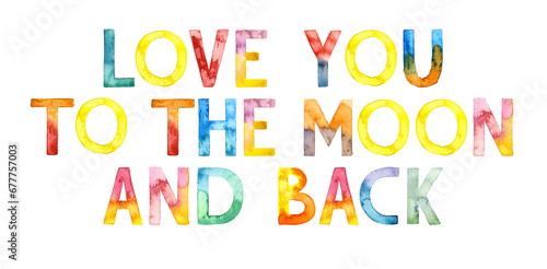 © Nataliia, Fototapeta premium Watercolor hand drawn lettering isolated on white background. Handwritten message. Love You to the Moon and Back. Can be used as a print on t-shirts and bags, for cards, banner or poster.