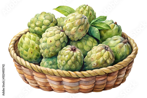 Fototapeta premium Watercolor hand drawn Lots of Custard apple in a basket on white background