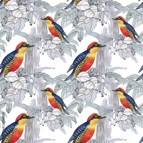 Obraz premium Watercolor hand drawn seamless pattern with tropical summer flowers and exotic birds