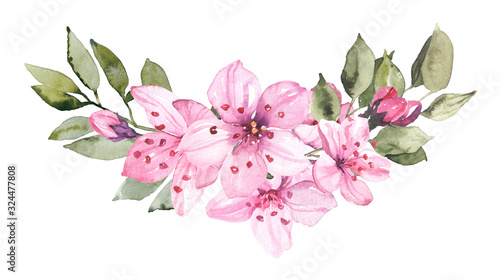 © Salnikova Studio, Fototapeta premium Watercolor hand painted sakura cherry blossom flowers with leaves branches illustration isolated on white background